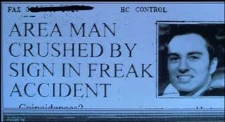 | Hey, do you guys remember that theatre in Paris that collapsed last year and killed everybody inside? Well, I had tickets to go. But one night, you know, I'm, heh, in Paris and I'm just tripping on acid and sipping lattes and such. And then all of a sudden, this dude out of nowhere just gets whacked by this falling sign.