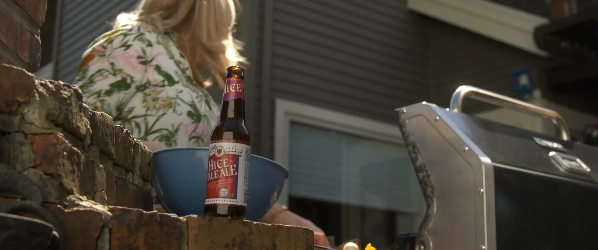Howard Campbell worked as a PR specialist for Hice Pale Ale and wore a Hice Pale Ale t-shirt when Stefani Reyes visited him. Later, during the barbecue party, Howard is drinking a bottle of Hice Pale Ale, which his wife Brenda accidently knocked off from the outdoor fireplace, causing it hits and turns on the hose, eventually causing Howard's death when his face is shredded by a lawnmower.